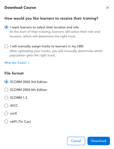 When downloading Harassment Prevention SCORM file from Ethena, you can choose between two options: I want learners to select their location and role, or I will manually assign tracks to learners in my LMS. If you choose the first option, you'll receive one SCORM file that can be sent to all team members regardless of role/location. If you choose the second option, you'll receive individual files for each Harassment Prevention track (more information on tracks here).