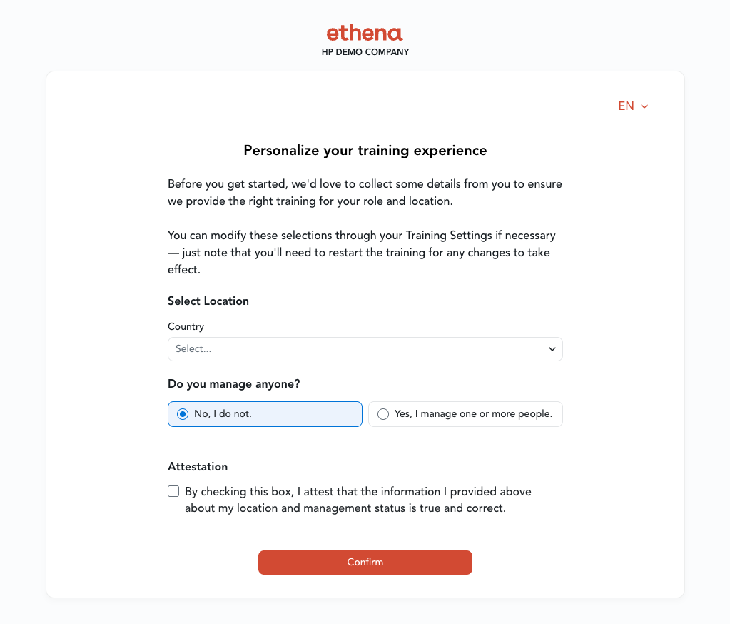 Once they select their country, state (if US-based), and manager status, they'll need to attest that the information they provided is correct. After they select 'Confirm', they'll be taken to the correct version of training that's most relevant to them.
